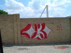 Red and White Graffiti tag removed by G.R.S from facebrick